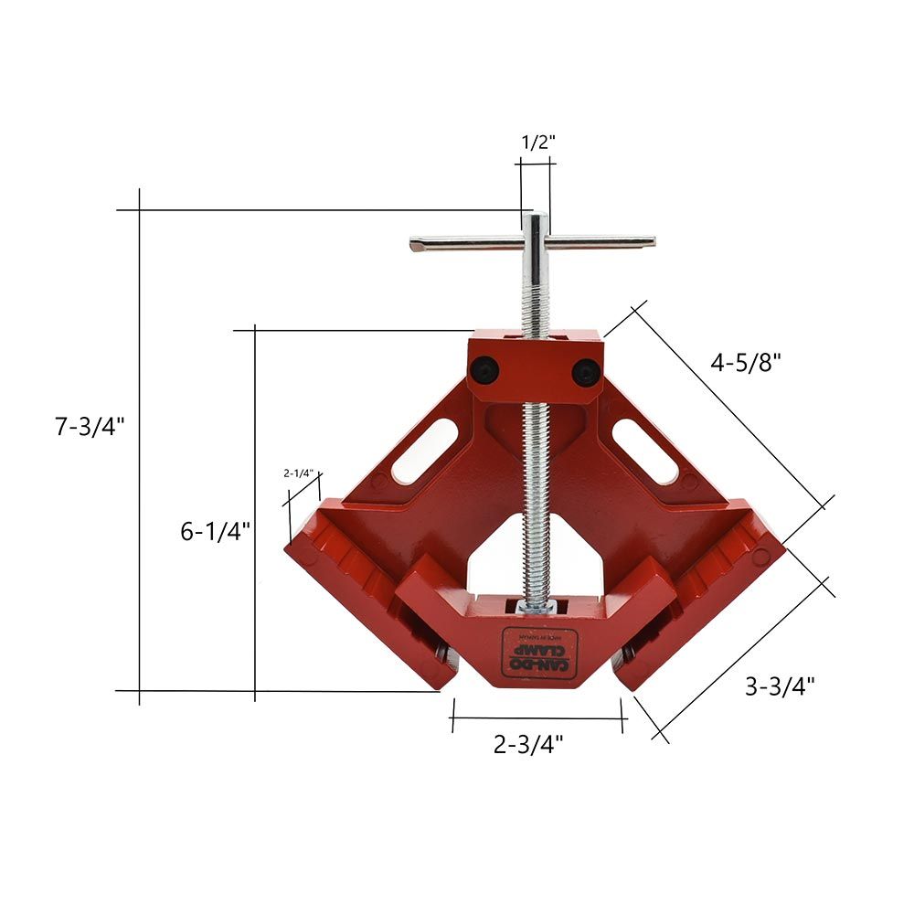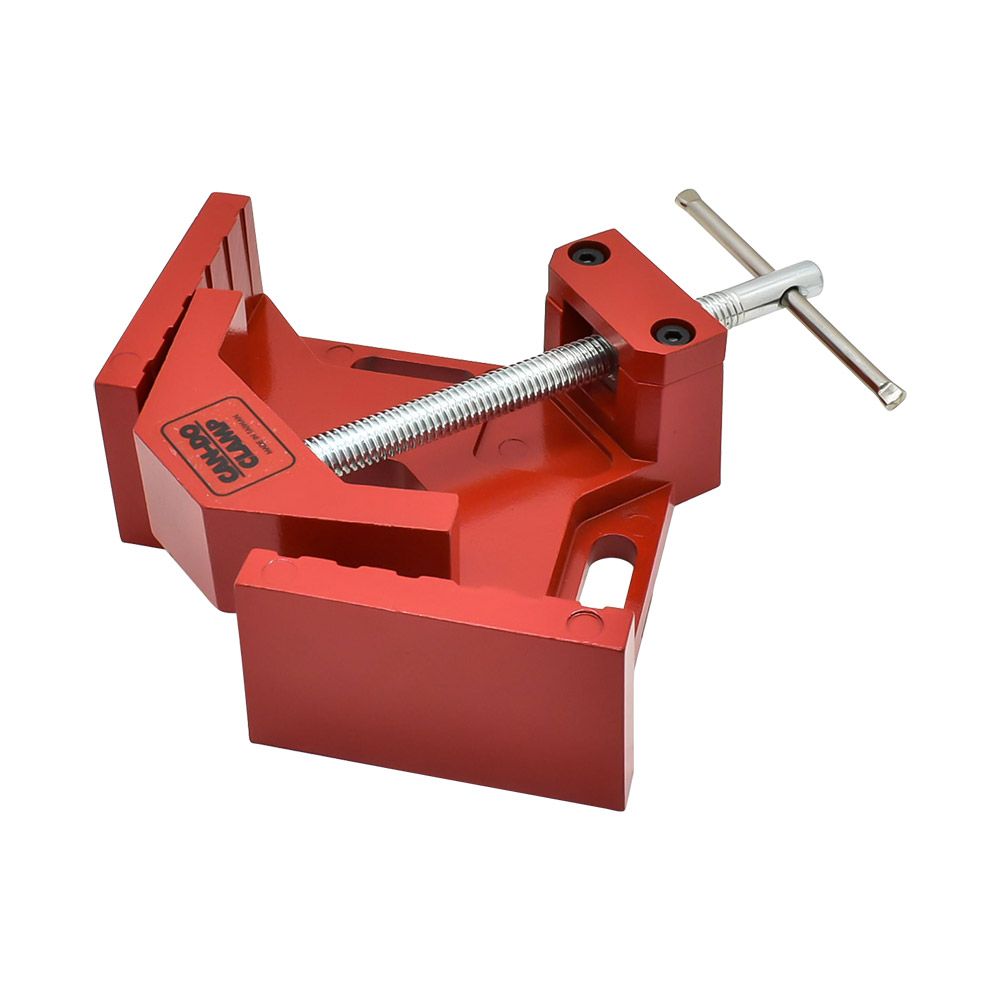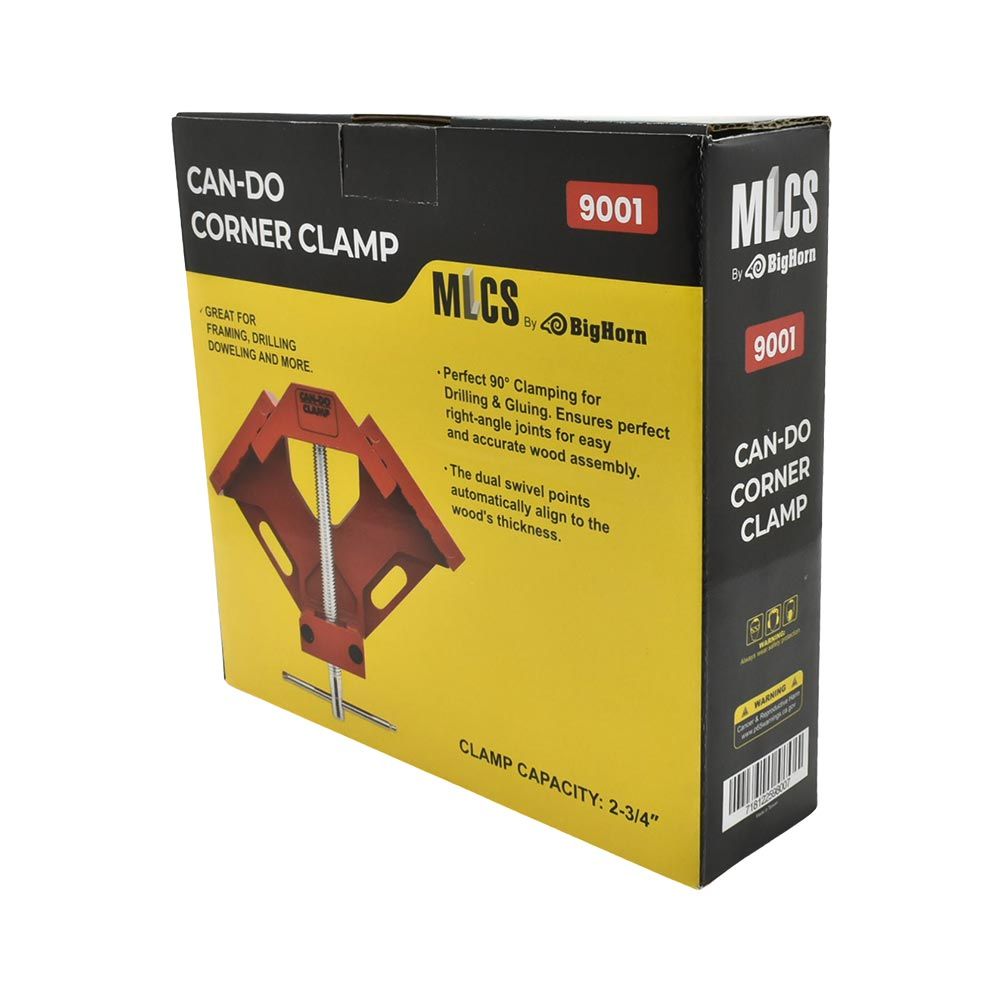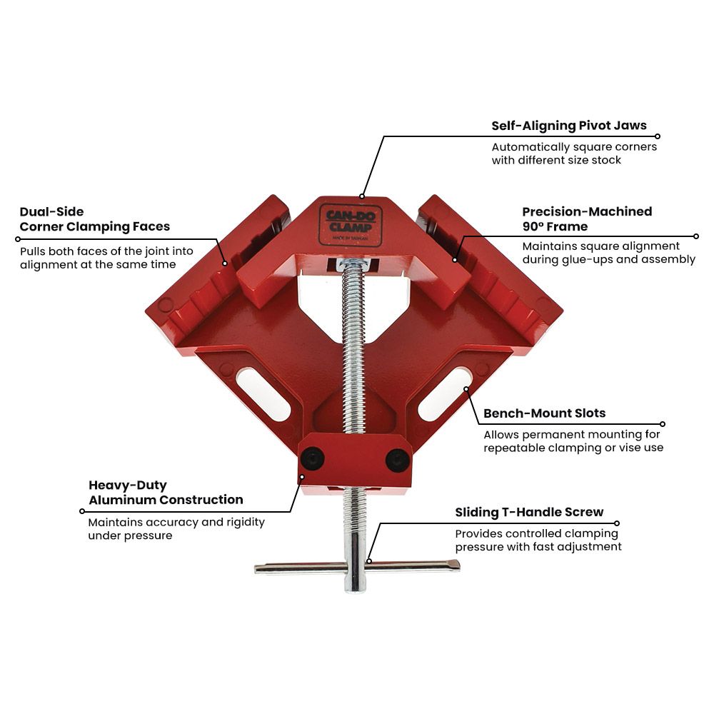 The MLCS 9001 Can-Do Corner Clamp is built to square and hold 90-degree joints during woodworking, cabinet assembly, and general shop work. It pulls both faces of a joint into alignment at the same time, allowing accurate assembly even when mating boards are different thicknesses. A pivoting jaw system self-aligns as pressure is applied to keep corners square without forcing stock into position. The sliding T-handle provides strong and controlled clamping pressure, while the heavy-duty cast and precision-machined frame maintains alignment during gluing, drilling, and fastening. The clamp can be used as a corner clamp, a 90-degree clamp, or mounted to a workbench to function as a compact vise for repeatable shop operations.