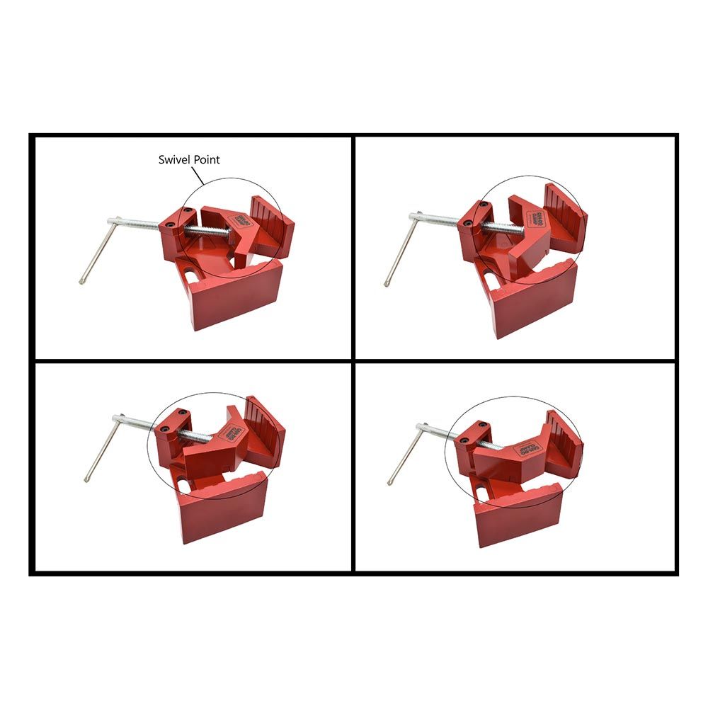 • Maintains square corners even when clamping uneven stock by allowing the jaws to pivot and self-align during tightening.