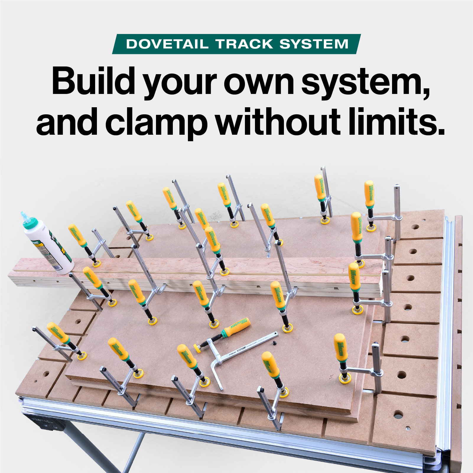 With any standard 1/2” 14-degree dovetail router bit, you can create your own clamp tracks, eliminating the need for expensive aluminum tracks. It’s an entire system designed to give you all the functionality of T-track and T-track accessories, at a fraction of the cost.