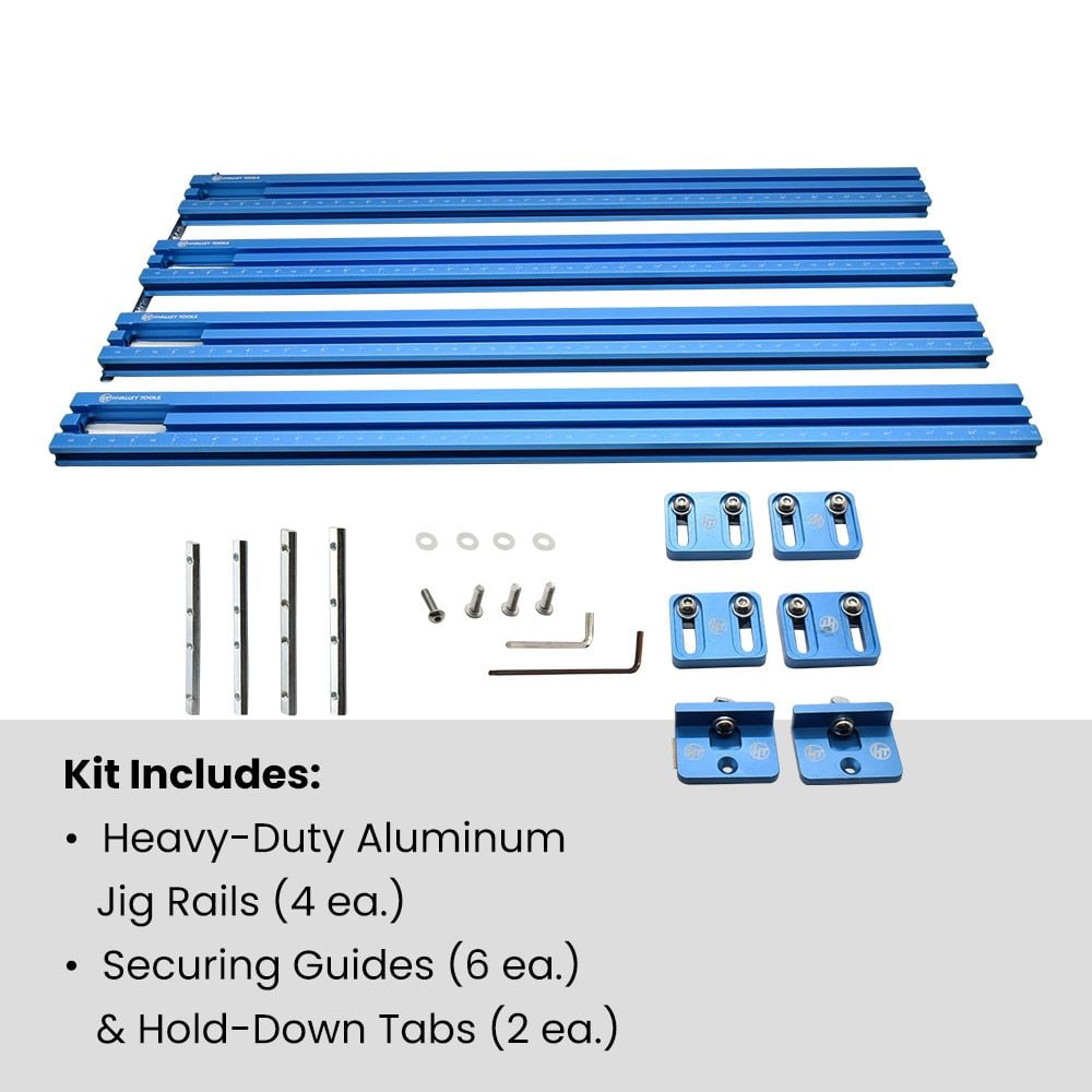 - Heavy-Duty Aluminum Jig Rails (4x 23.5″) with Imperial Markings