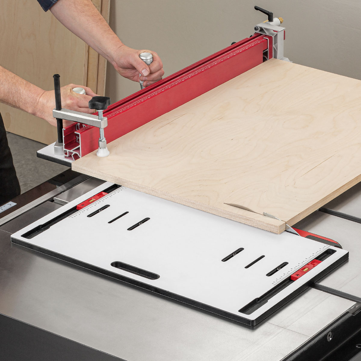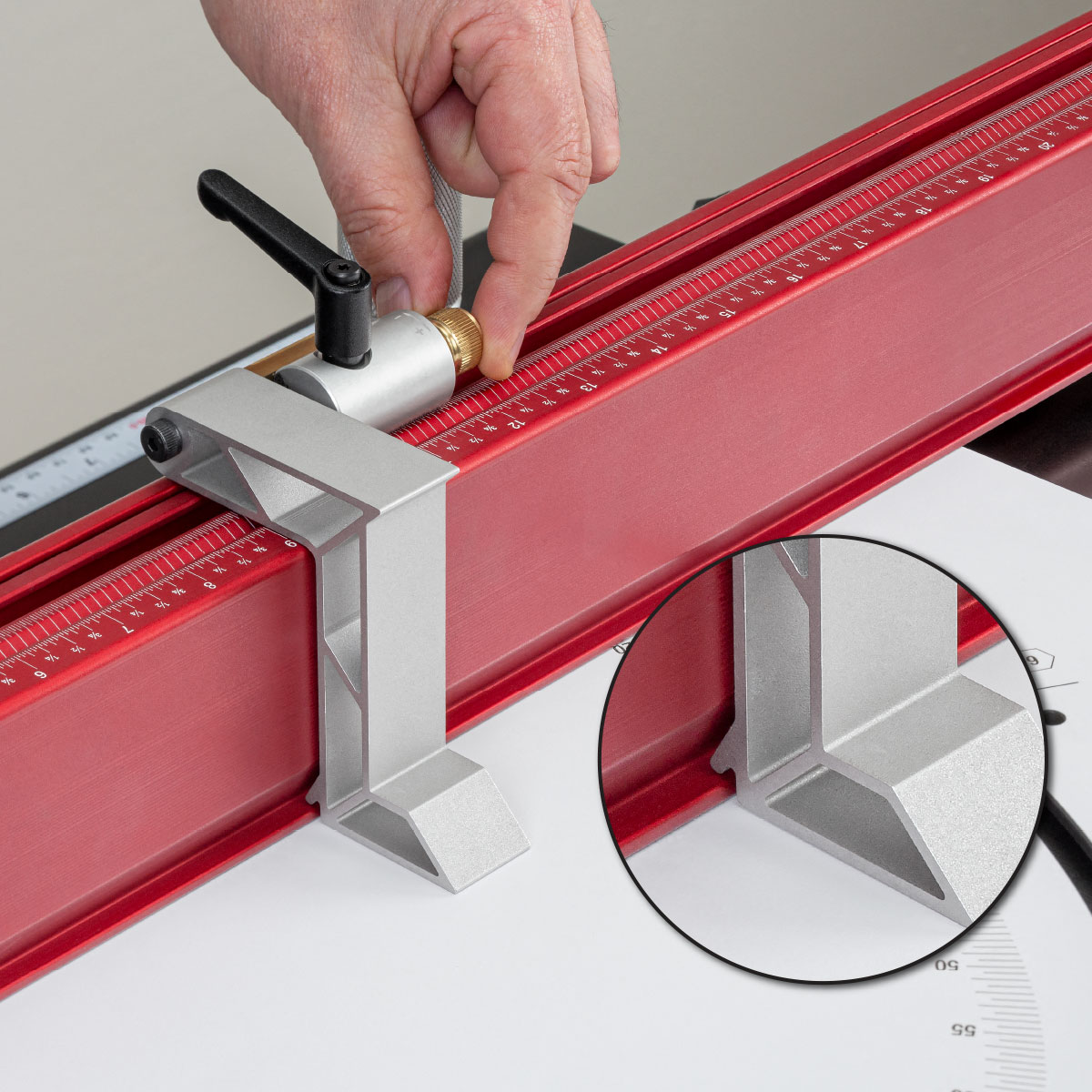 We use our CNC mills to perfectly locate stops for common miter angles. Just depress the pin while moving the fence into position and you’ll lock in at the perfect angle. No test cuts, no gaps, just perfect miters. To complement the dialed-in accuracy of the protractor, the micro-adjustable flip-stop has a section that nests back into the face of the fence. This prevents sharp mitered ends from lifting the stop out of position. While miter cuts are crucial, most woodworkers first consider a miter sled because they need a better way to handle wide cross-cuts. To make sure the AutoScale delivers flawless wide panel cuts we put two T-slot washers on the front end of the runner, not just one. This helps keep the sled aligned when you’re using the full 24″ cross-cut capacity. If your saw doesn’t have a T-slot, the washers come off in seconds.The miter bar has a series of 5 leaf springs along the edge that keep it snug in any miter slot, whether it is perfectly sized, poorly machined or old and worn. If the slot is inconsistent, the springs expand or compress to keep the bar aligned and the feed resistance uniform…no tight spots or wiggly areas. We also added a shelf at the end of the fence extension so long boards are fully supported throughout the cut.